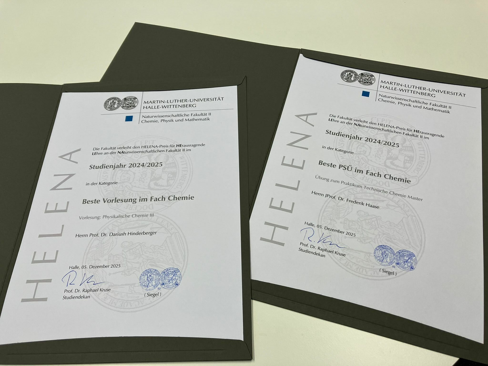 Our BEAM PIs Dariush Hinderberger and Frederik Haase have each received a Helena Award for outstanding teaching at the Faculty of Natural Sciences II.Dariush Hinderberger received the award for the best lecture in chemistry and Frederik Haase for the best PSĂ (Praktikum, Seminar, Ăbung) in chemistry. The award ceremony took place last Friday. Congratulations!